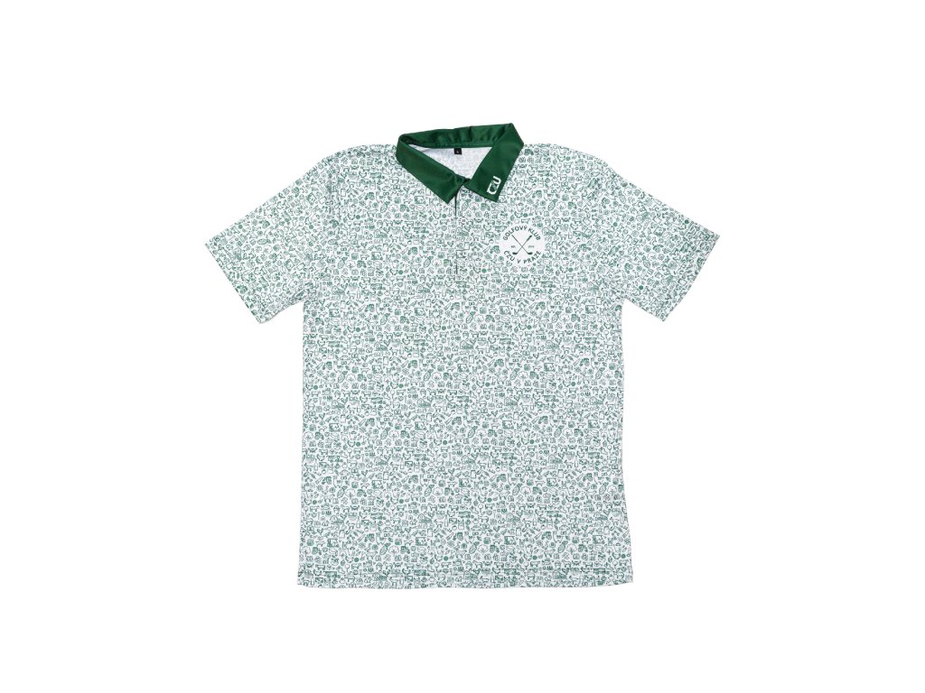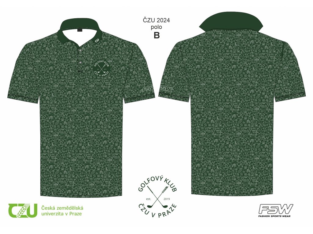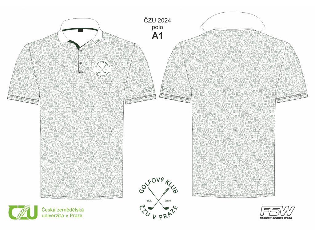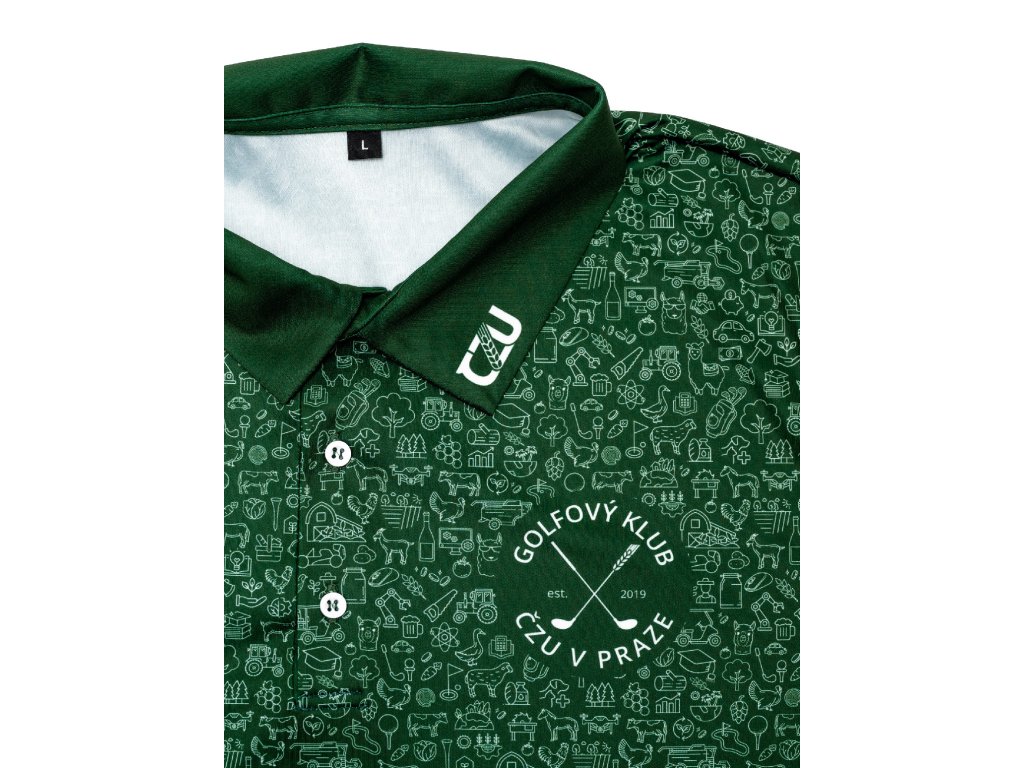 Pánské golfové tričko s límečkem, tématickým vzorem a logem ČZU a GK ČZU.